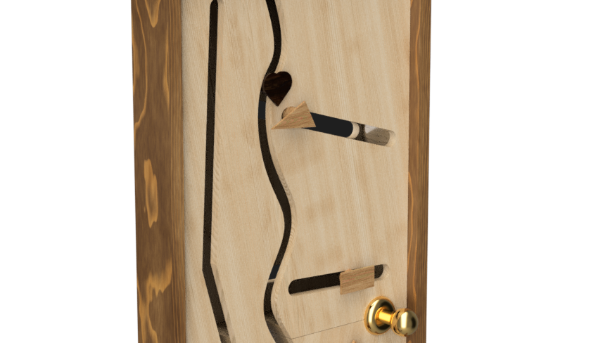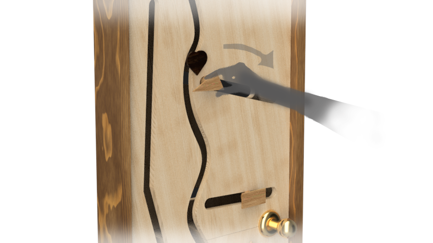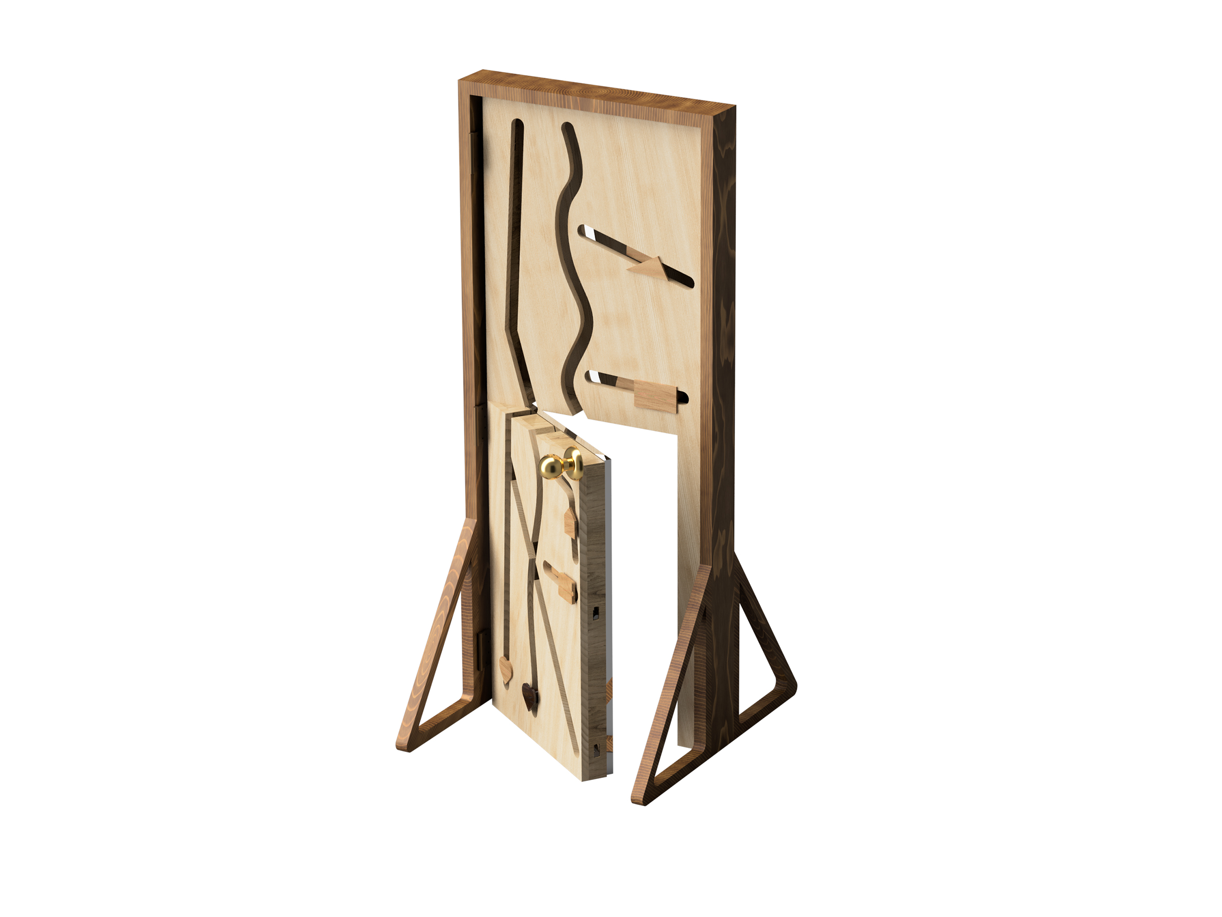 Explanation This free-standing entryway provides an interactive experience for adults and children alike. People will be provoked to try to unlock the door by exploring the paths created by privilege and minority struggle with the embedded moving pieces. Once both the heart pieces have reached the end of their path the lower half of the door will be unlocked creating an entry to a world without privilege for future generations.