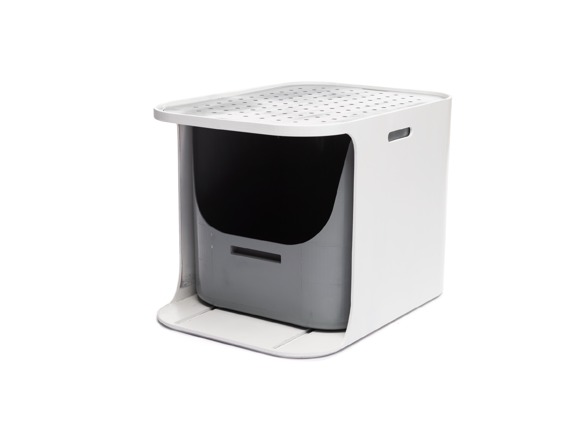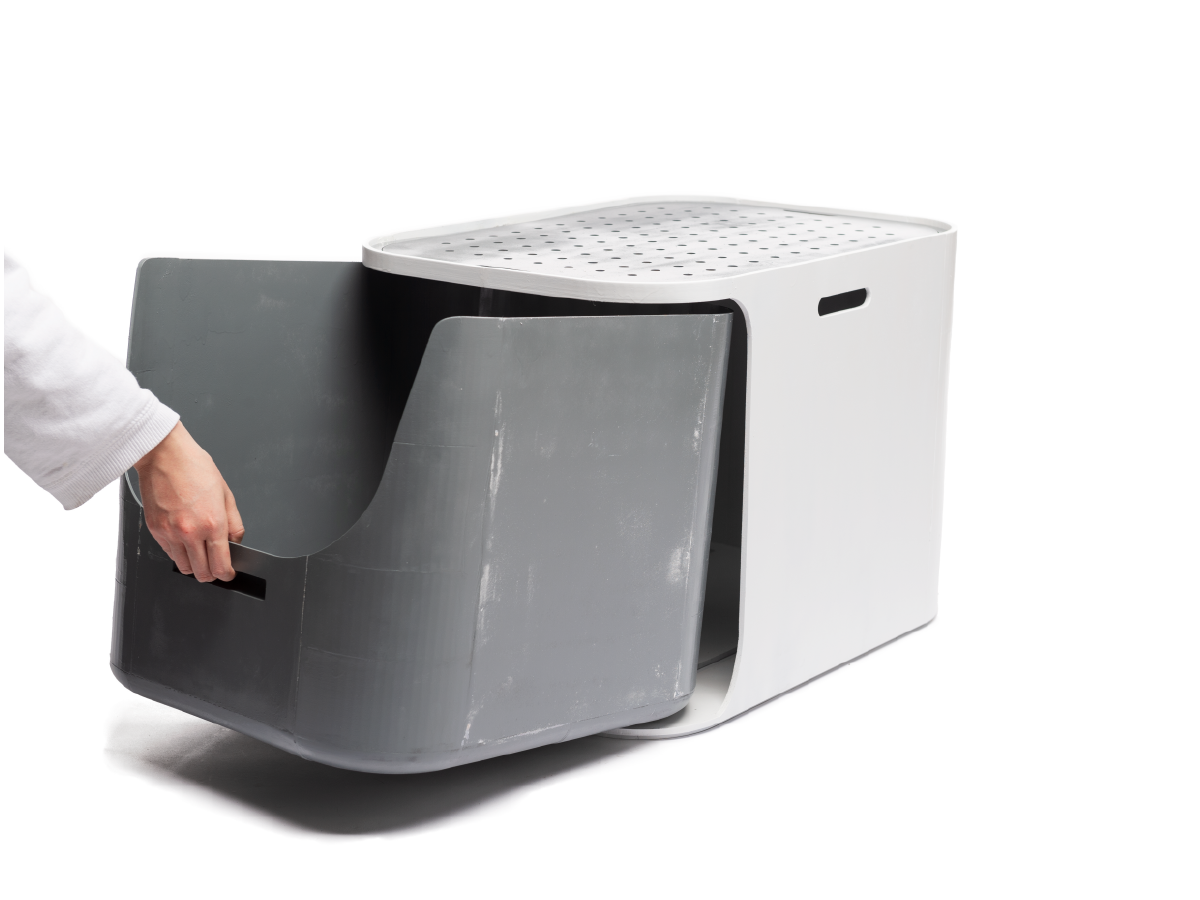 Stacking Litter Box is an innovative, space-maximizing solution for multi-cat households in small living environments. Top rim and extruded bottom of the outer box provides the stable stacking, allowing the user to place two litter boxes in the space for one. Cleaning is designed to be easier for both top and bottom litter boxes with the slide-out inner litter tray and opening lid of the outer box.