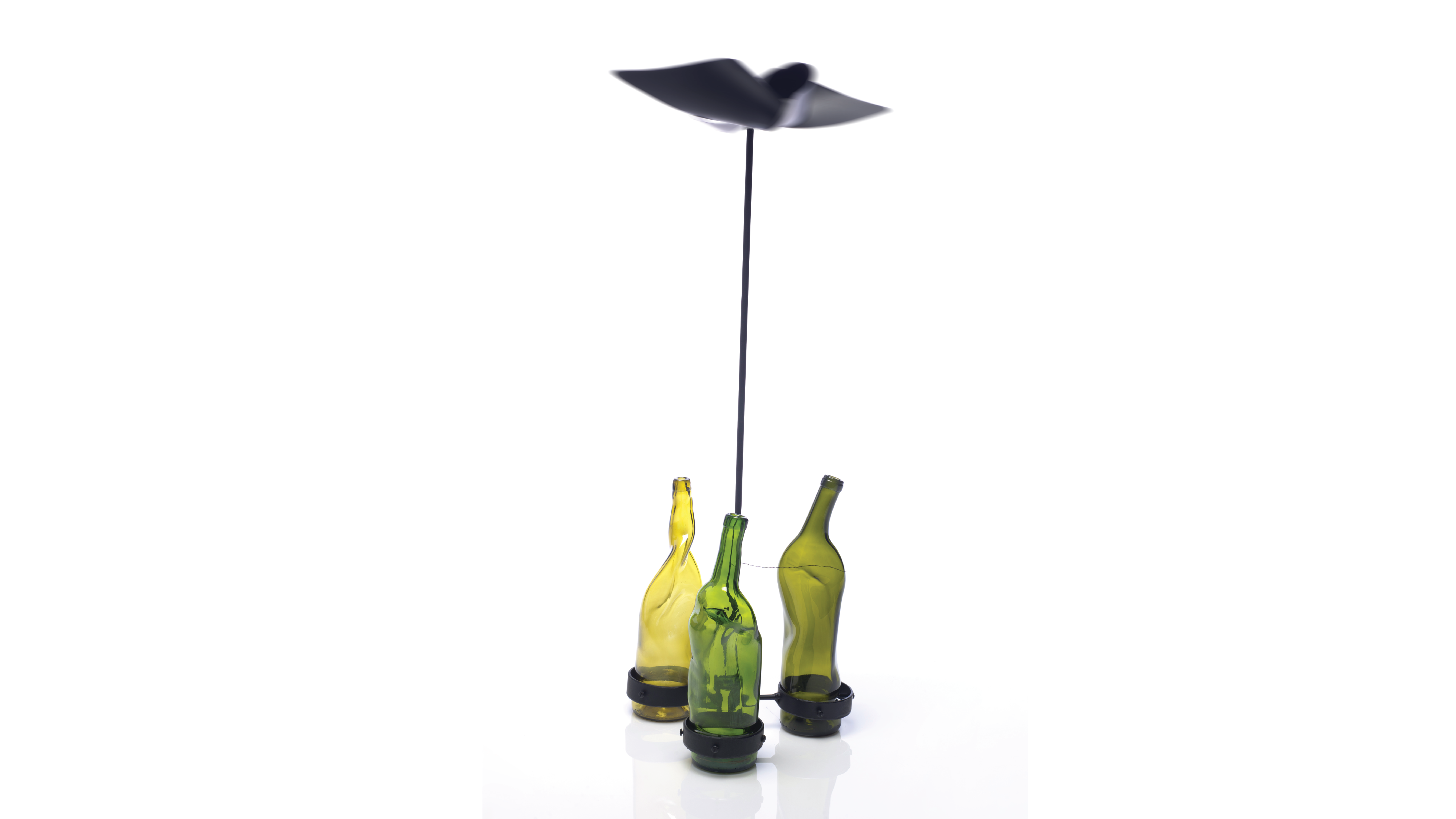 Solution: A wind powered vessel for sound that interacts with the weather. A three toned piece that changes tone as the rain fills the bottles and chimes even faster as the wind blows harder.