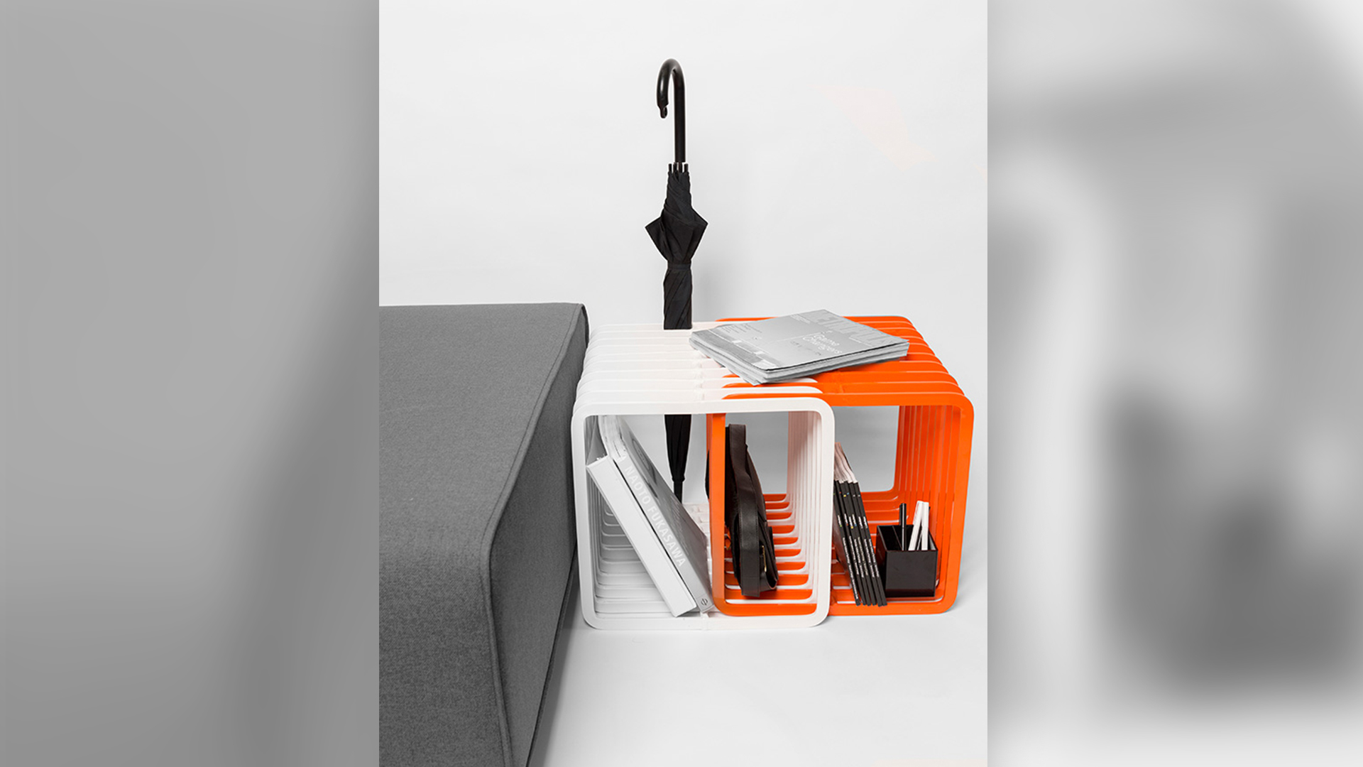 This series of lattice storage units are designed to inhabit any office and encourage personalization. When the units nest together, they’re intersecting loops make new volumes, while the individual components fit comfortably within, alongside, or even on top of Poppin’s existing accessories and furniture. The structure encourages an array of functions, acting as a shelf, file sorter and even a side table. Simple. Innovative. Poppin.
