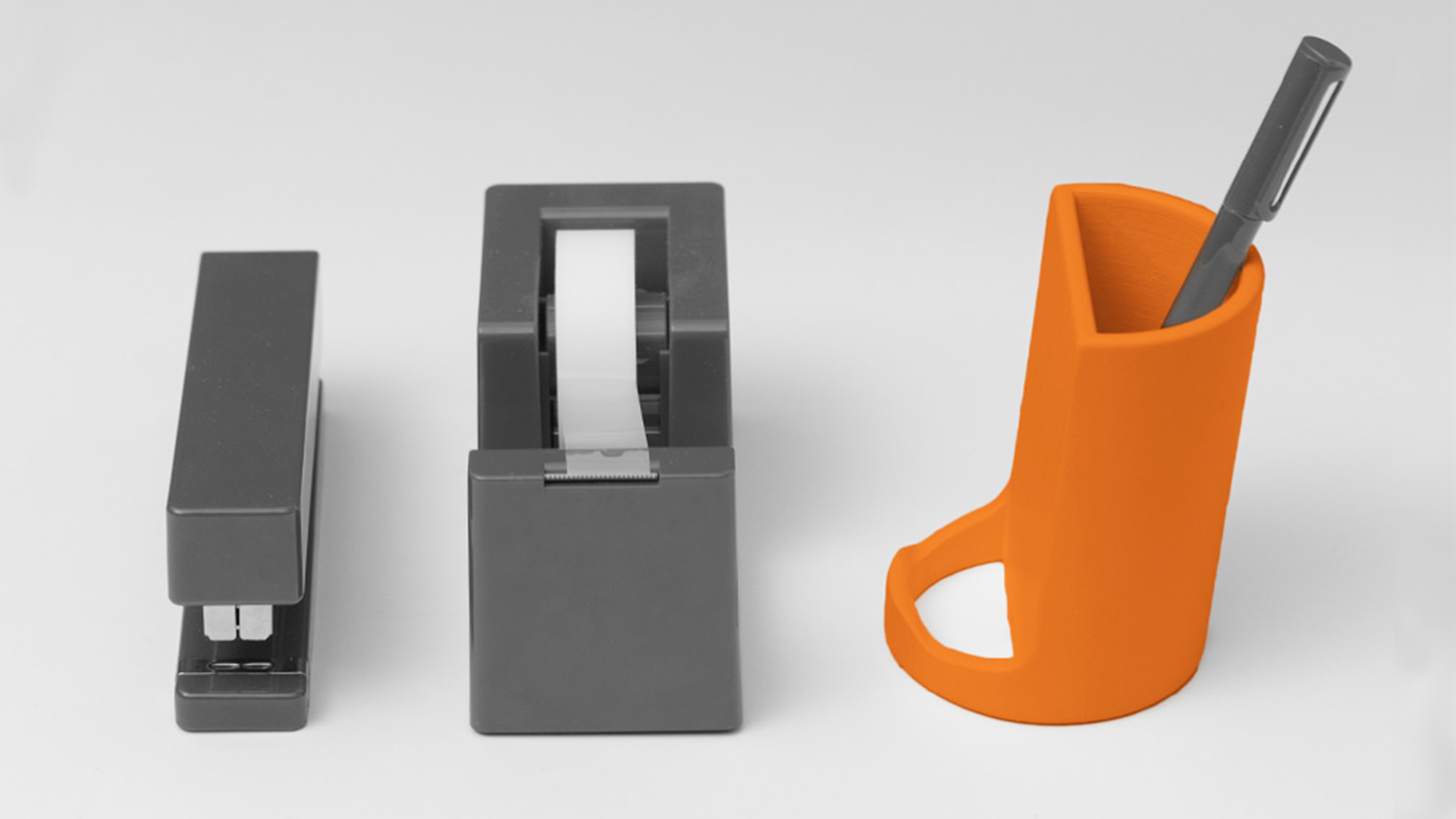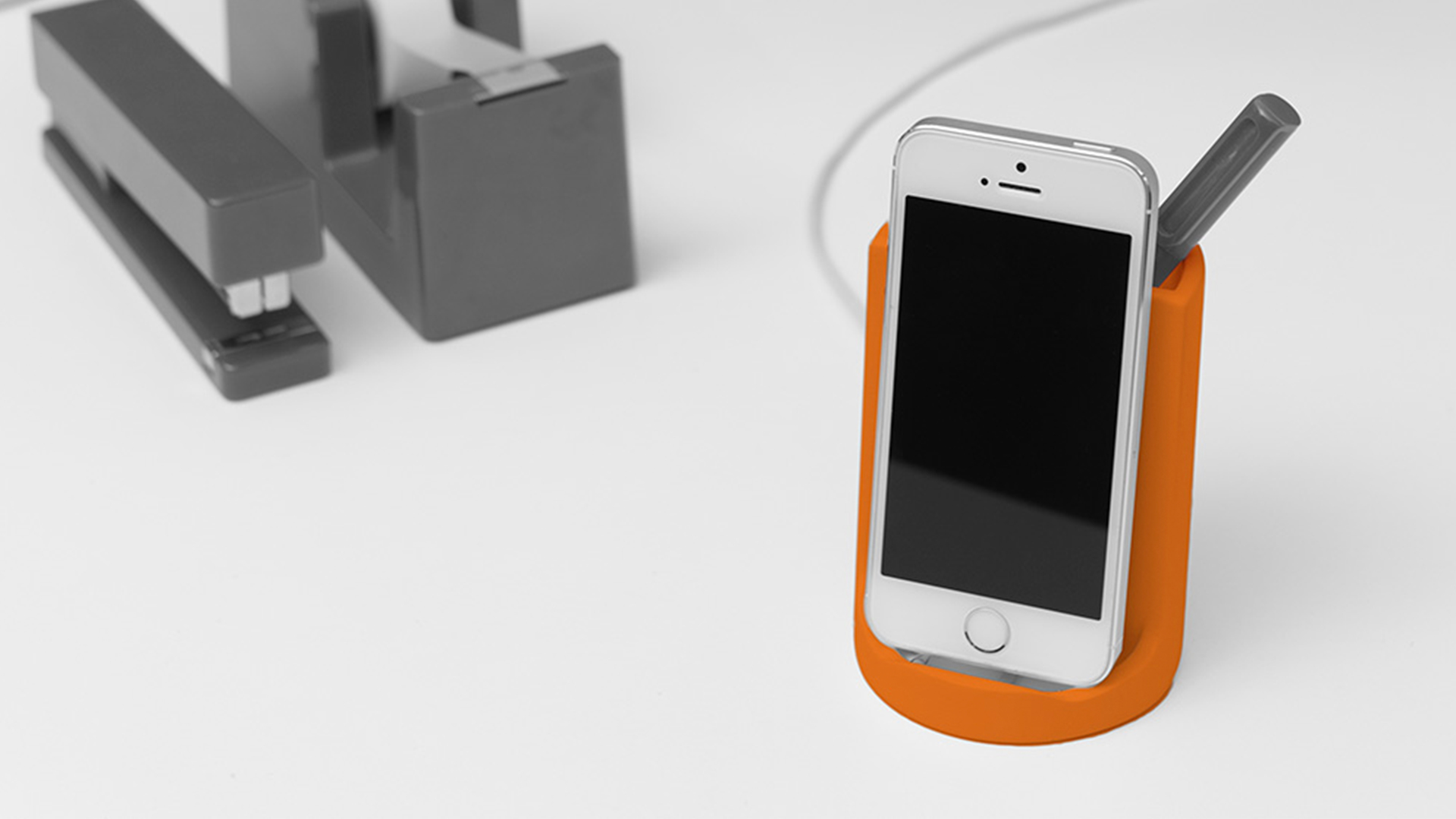 Accessory Desk Context We are in an age where people always carry cell phones with them. In order to give people an accessible and more comfortable experience when providing a space for their cell phones at work, I created a design that combines a penholder with a cell phone holder. This design is a multi-functional table accessory that works efficiently and save space on table. The leaning angle of the product makes pens more organized, and the bottom details create enough space for the charging cable to go through.