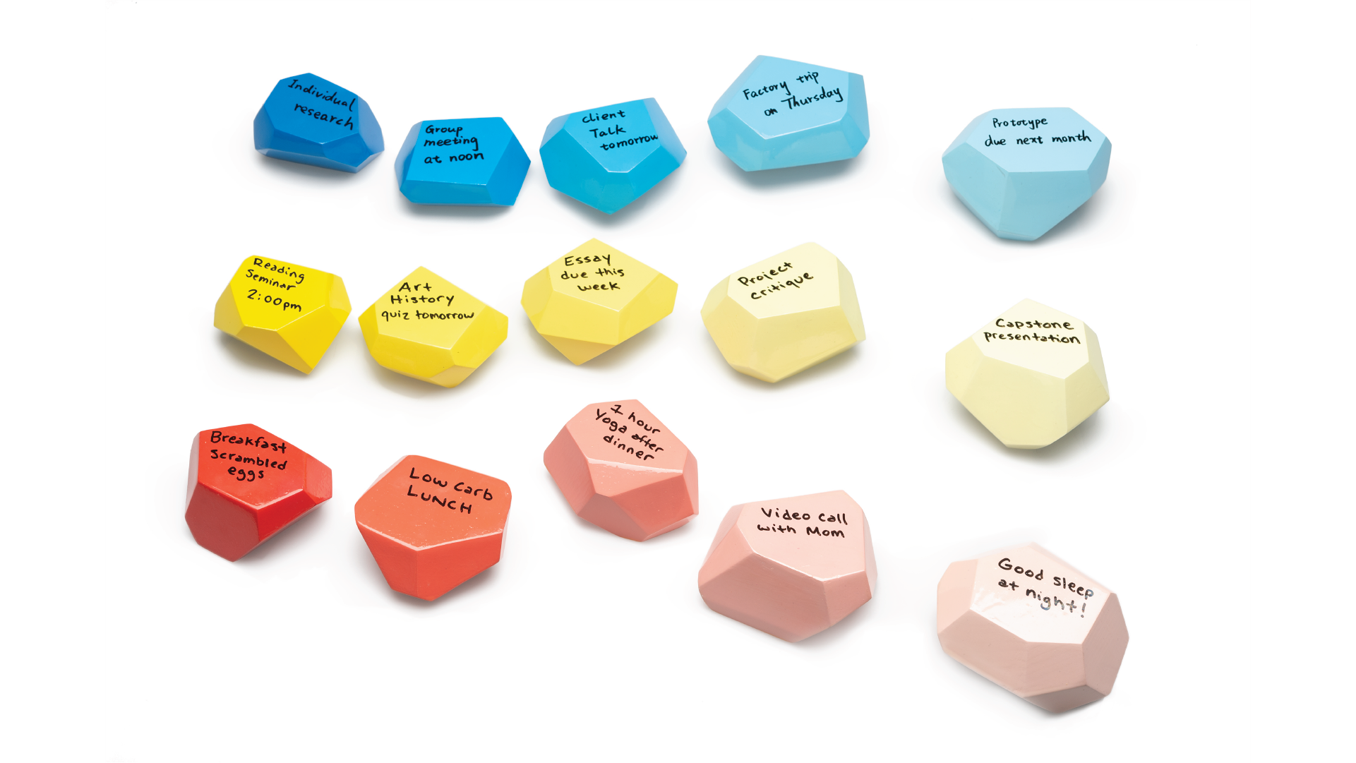 Stacking reminder is a cairn-like memo system that encourages users to organize their time emotionally through color, shape, and gravity. The color gradient indicates the urgency of the matter so that users can stack, write, and erase easily to manage time in a highly personal way.