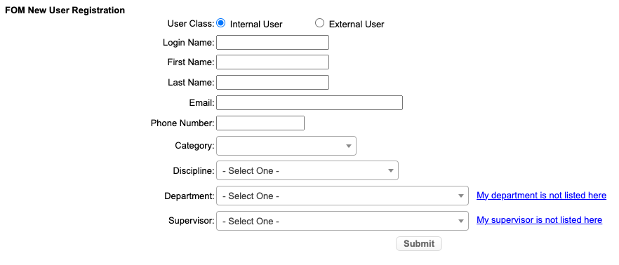 From there – enter in your user information and hit the submit button – for now, choose Tom Grimsley as your supervisor. This might eventually be your own PI/advisor in the future.