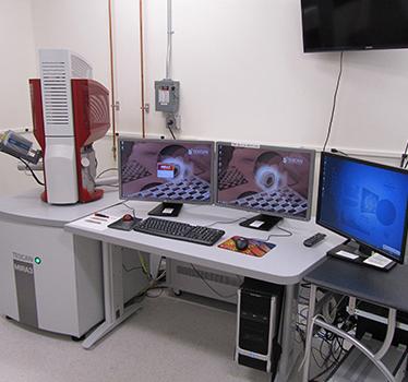 This new microscope was installed in late 2015. It uses a field-emission electron gun to achieve 2-nm resolution at 30 kV. The chamber can accommodate specimens with a maximum diameter of 100 mm and about 30-mm thick. It operates between 0.5 and 30 kV, and has beam deceleration technology to enhance resolution at low operating voltages. Magnification is continuously variable up to 1 million. The microscope is fully digitally controlled for easy and dependable performance. It has both secondary and back-scattered electron detectors. Attached to the microscope is a Bruker energy dispersive spectrometer. This allows for compositional analysis in field-of-view, spot or small area, linescan, and mapping modes. Using the latter mode, the user can determine the spatial distributions of the elements in the sample. Quantify options are available in all modes for the quantification of elements present.