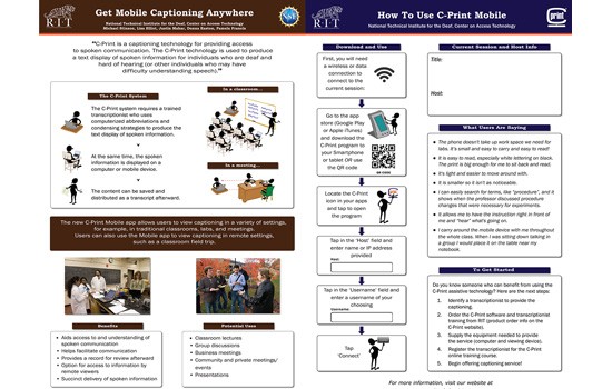 - Al Sigl Community of Agencies Award for the best poster presentation, given for clarity of presentation, technical merit and impact. The award was given to C-Print Mobile: Michael Stinson, Donna Easton, Lisa Elliot, Justin Mahar and Pamela Francis, all faculty or staff from RIT’s National Technical Institute for the Deaf. The C-Print Mobile app allows users to view captioning in a variety of settings, for example, in traditional classrooms, labs and meetings. Users can also use the mobile app to view captioning in remote settings, such as a classroom field trip.