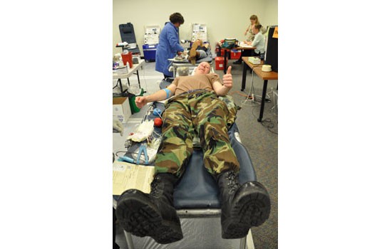 Cadet Kyle Eich gives a thumbs up while donating blood at last year’s Air Force ROTC/American Red Cross Blood Drive in the Gordon Field House.