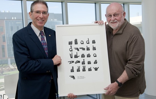 RIT alumnus Peter Blacksberg, left, displays his American Sign Language modern typeface with Professor R. Roger Remington, the Massimo and Lella Vignelli Distinguished Professor of Design at RIT. Blacksberg has been refining the typeface for 42 years.
