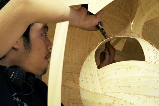 HeeChan Kim, an MFA student in the wood program, puts the finishing touches on one of his pieces.