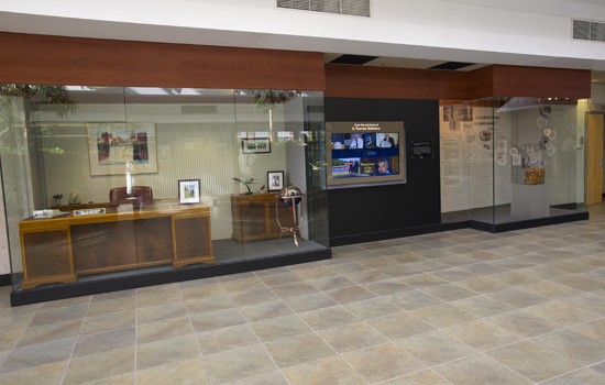 A display in the atrium of Golisano Hall on the RIT campus celebrates the personal and professional archives of entrepreneur and philanthropist B. Thomas Golisano.