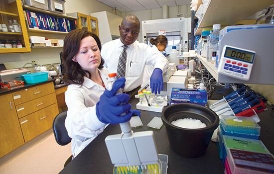 Tara Snyder ’17 (biomedical sciences), left, conducted research on sickle cell disease and malaria with Bolaji Thomas, associate professor of biomedical sciences. Thomas has established an independent immunology research program focused on the training of undergraduate students.