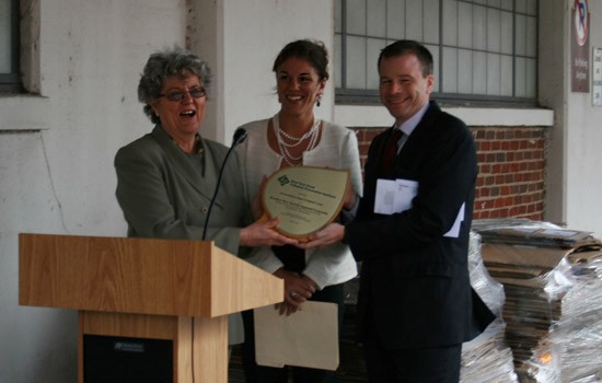 Anahita Williamson, center, director of the New York State Pollution Prevention Institute, presents Andrew H. Kimball, right, president and CEO of the Brooklyn Navy Yard Development Corp., and Sara Garretson, president of the Industrial Technology Assistance Corp., with the institute’s Advancement in Cleaner Production Award for creating an eco-industrial recycling model that has made a significant environmental and economic impact in North Brooklyn.