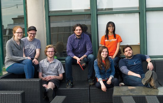 RIT graduates at Carrot Creative include, from left to right, Emily Okey ’12 (graphic design), Ben Gage ’12 (graphic design), Alex Rainone ’13 (new media design), Chris Petescia ’05 (graphic design), Bridget Brennan ’10 (graphic design), Whitney Brown ’14 (new media design) and Tony Briceno ’09 (new media interactive development).