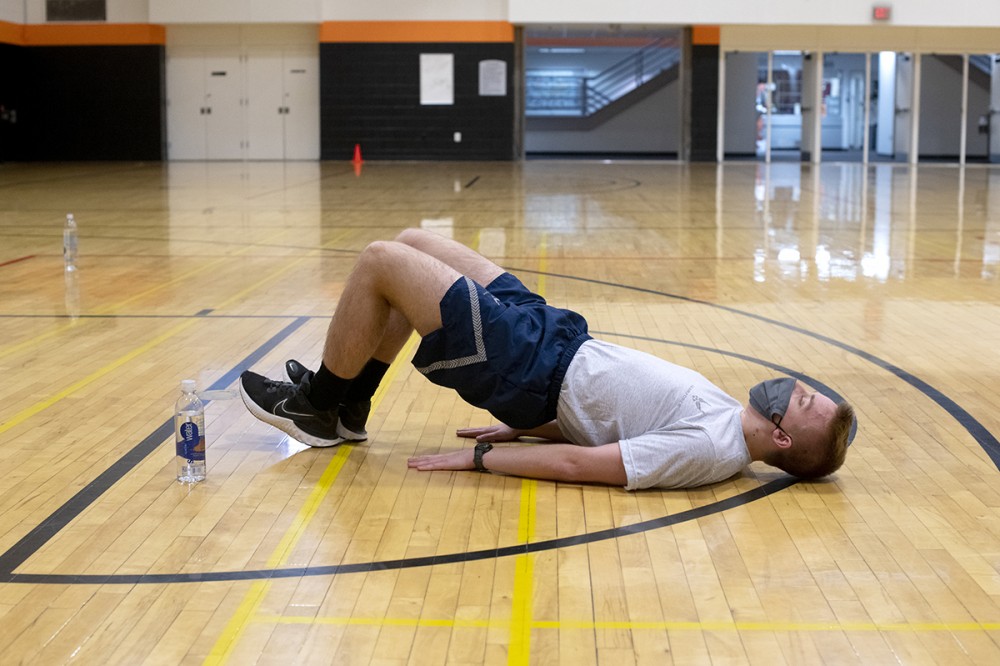 Cadets in RIT’s Air Force ROTC Detachment 538 continued training in the Student Life Center throughout the COVID-19 pandemic. Here, Cadet Zachary Foster does strengthening exercises.