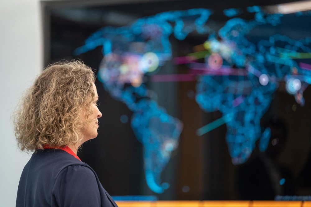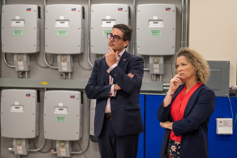 Nabil Nasr, associate provost, founding director of Golisano Institute for Sustainability, and founding CEO of the REMADE Institute, leads members of the British Consulate General and RIT Government and Community Relations on a tour to highlight innovation at RIT. From left to right: Ben Brierley, British Consulate Head of Policy and State Government Relations; Emma Wade-Smith, His Majesty’s Trade Commissioner for North America and His Majesty’s Consul General New York; Eleanor Boyer, Technology Sector Director; and Garrett Dunlap, Head of Science and Innovation. The delegation spent Monday touring areas around Rochester that highlight the region’s expertise in the semiconductor, cybersecurity, and renewable energy industries.
