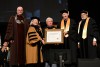 Five honorary degrees were conferred during the commencement ceremony on May 12. Among those recognized was Charles Gaines, renowned artist and 1967 MFA graduate of RIT’s College of Art and Design, center, who received an Honorary Doctorate of Fine Arts degree in recognition of his influential contributions to contemporary art and his continued commitment to education. Pictured, from left to right, are RIT President David Munson, RIT Provost Ellen Granberg, Gaines, RIT Board of Trustees Chairman Jeff Harris, and RIT Trustee Hope Drummond.