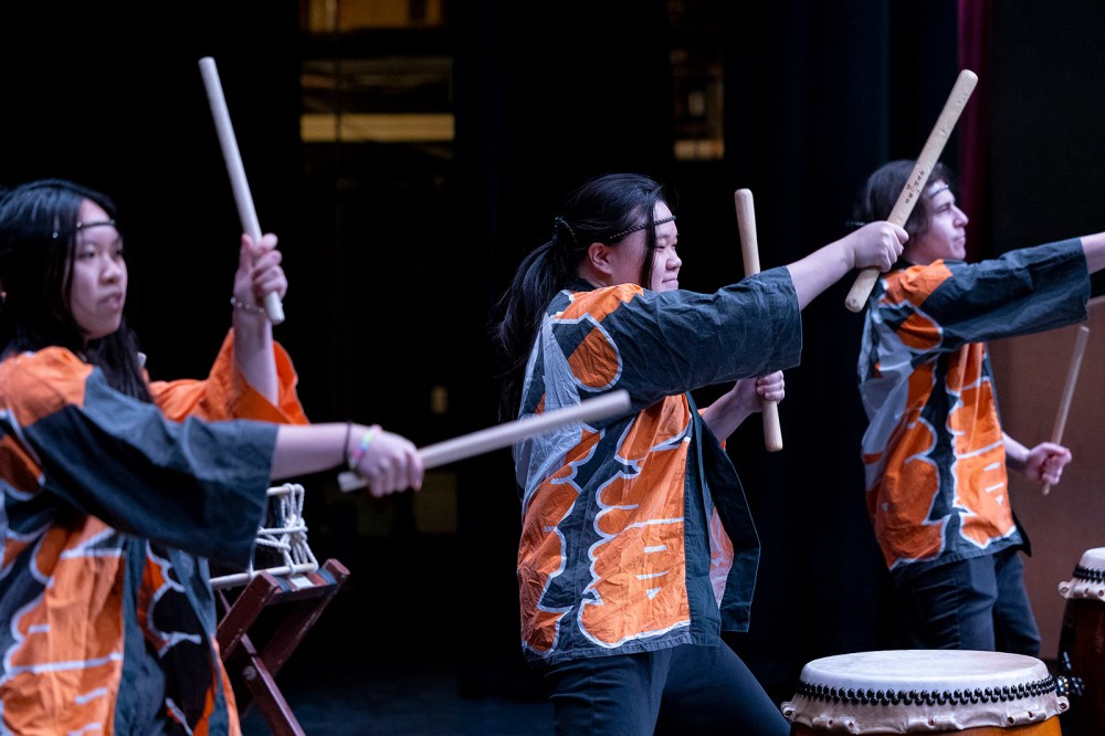 Meihua Zhou, left, Krystal Hsieh, center, and Robert Casabianca, members of WADAIKO, a Japanese drumming club formed in 2016, performed in Ingle Auditorium during Ovation: RIT Performing Arts Showcase on Feb. 7.