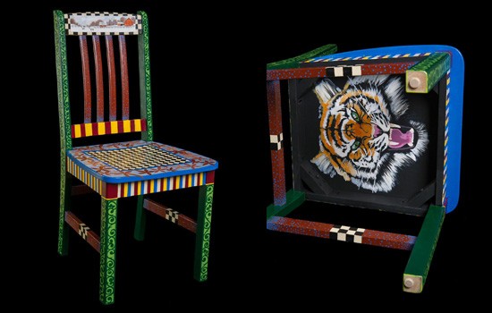 One of the talented artist contributors is David Thelen, who works in ITS Network Support at RIT. He said he went into a “Zen state of mind” and spent the entire Christmas break designing and working at “Tiger Pride on the Inside.” The hand-painted chair features a roaring lion underneath the seat, complemented by black and check flowered pattern on the outside and highlighted with a winter country scene.