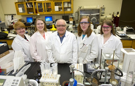 Taylor Barrett, left, Chelsea Weidman, Hans Schmitthenner, Stephanie Beach and Lauren Heese conducted groundbreaking research on targeted molecular imaging agents over the past three years. Schmitthenner, who joined RIT’s faculty in 2010, credits Barrett, Weidman, Beach and Heese with the success of his lab and research.