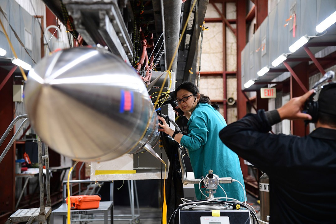 Chi Nguyen ’21 Ph.D. (astrophysical sciences and technology) makes final adjustments to the rocket payload prior to CIBER-2’s launch.