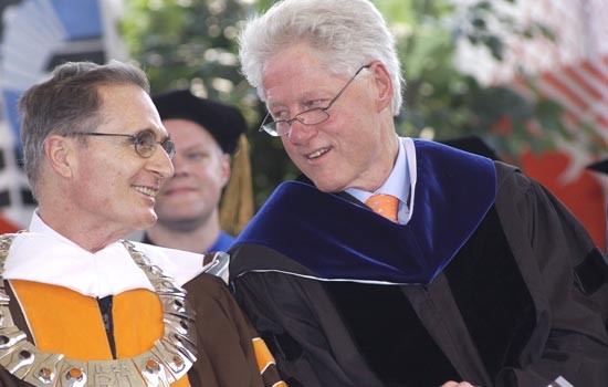 RIT President Albert Simone, left, with former U.S. President Bill Clinton at RIT’s Academic Convocation on May 25. Clinton delivered the keynote address at the ceremony.