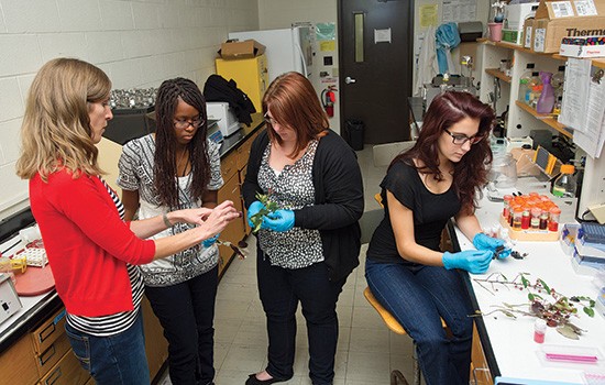 RIT is seeking to establish a $1 million undergraduate research fund in the College of Science with help from a challenge grant from the Fred L. Emerson Foundation. The fund would be used to encourage students to pursue careers in science and mathematics and could be used support a variety of research, such as the ongoing research in the Thomas H. Gosnell School of Life Sciences led by Assistant Professor Susan Smith Pagano, left. Charmaine Merchant, second to left, is currently a fourth-year student and continues to conduct research in Pagano’s lab. She is shown here with Cassie Gould and April Meier, now 2014 alumnae, at right, examining wild fruit specimens to determine the nutritional health of migratory birds.