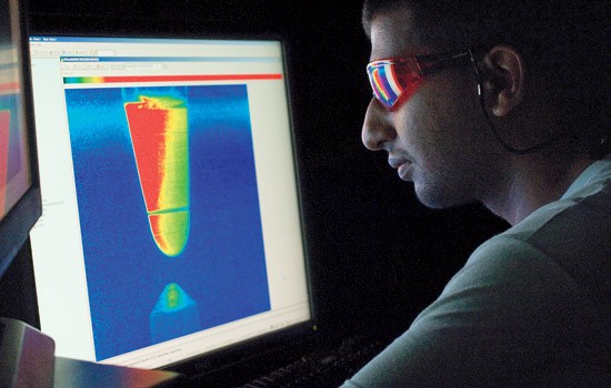 Amit Chainani, a graduate student in the Kate Gleason College of Engineering, reviews data collected during the experimental mixing process done in microwells, cone-shaped plastic cups within blood-analyzer machines. Research being done on the blood analyzers will improve indicators of infection or disease.