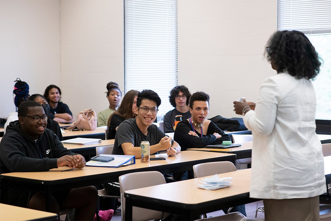 Makini Beck, right, an assistant professor in RIT’s School of Individualized Study, teaches a Foundations of Sociology class filled with students from the DDI Summer Experience program.