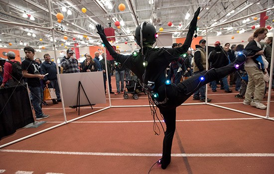 A student actor in suit studded with motion markers performed within a large capture space. Six cameras attached to the outer frame tracked the actor’s gestures. Cameron Calandra, first-year motion picture science major from Lockport, N.Y., took his turn in the suit to demonstrate the real-time motion capture system and discovered a hidden theatrical flair.