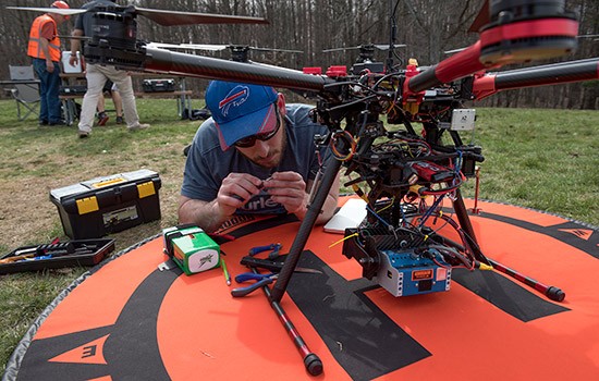Jeremy Sardella from Buffalo, N.Y., prepares a drone for a test flight at Mendon Ponds Park.