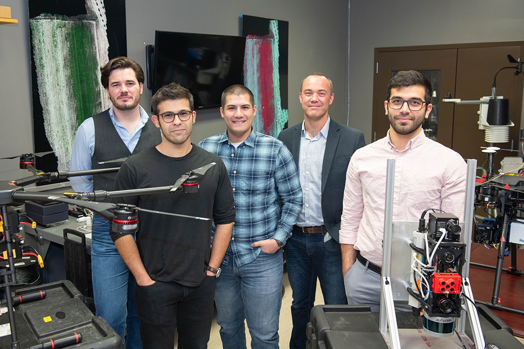 Jan van Aardt, back, professor of imaging science, and his graduate students use imaging systems on drones to develop precision agriculture practices. Left to right are: Ethan Hughes, MS student; Ali Rouzbeh-Kargar, Ph.D. student; Ronnie Izzo, MS student; and Amirhossein Hassanzadeh, Ph.D. student.
