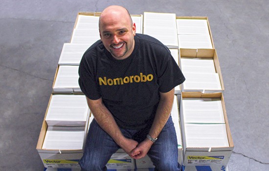 Aaron Foss ’00, ’01 stands next to boxes filled with robocall numbers his company has blocked.