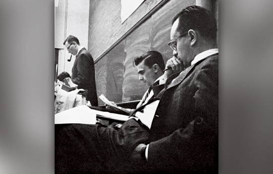 Eugene Fram, front, Gene Draper and Kay Finley ponder student council finances during the 1958-1959 school year.