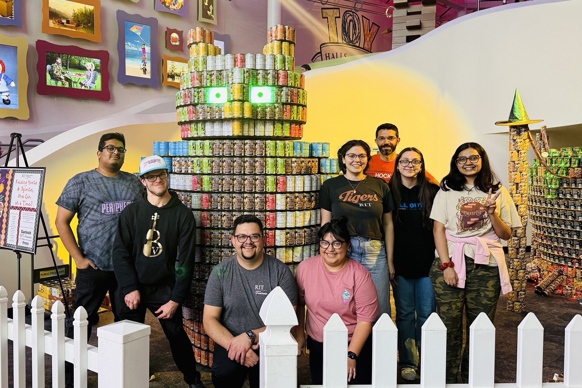 More than 1,500 pounds of canned goods were purchased to make the giant owl sculpture, complemented with sound effects, a motorized, 360-degree head, and LED-lit eyes. The participating students represented majors in the College of Art and Design, Golisano College of Computing and Information Sciences, and College of Engineering Technology. To prepare for the final construction, students made 3D CAD models and built armatures over two months of planning.