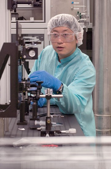 Researcher Jianming Zhou aligns the immersion lithographic system.