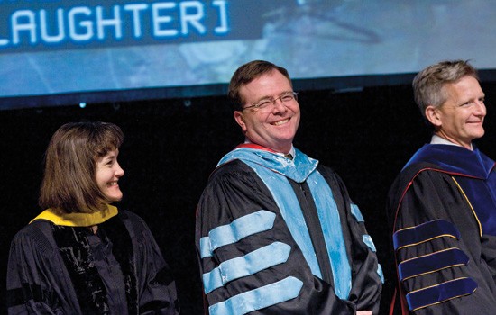Welcomed with academic pomp and circumstance and a theater filled with students, alumni, faculty, staff, community members, family members, local and state officials and even friends from Congress, Gerry Buckley ’78 (social work) was officially installed as president and dean of RIT’s National Technical Institute for the Deaf on May 6.
