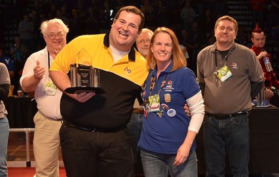At the recent FIRST Robotics Finger Lakes Regional, ESL Credit Union’s Dante DiLella was named Volunteer of the Year. He is a long-time supporter of the regional event and the FIRST program. DiLella is the event lead referee. Presenting the award was Elayne Stewart, a 2014 awardee, and also the regional’s head judge.