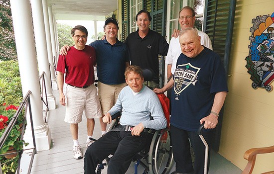 From left to right, teammates Jim “Squirrel” Pasquali, John “B.J.” Brennan, Tim “Tank” O’Grady, Chris “Crisco” Roe and Coach Peter “The General” Todd visited Nice at his home in Garrison, N.Y., in June 2012.