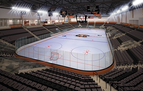 Renderings of the inside and outside of the Gene Polisseni Center. The building will be about 105,000 square feet, which is three times the size of Ritter Arena. It is expected to open for the 2014-2015 hockey season and will include four suites, multiple concession stands and a state-of-the-art scoreboard.