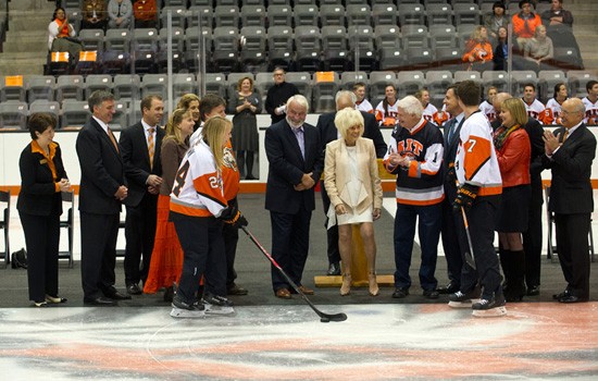 Wanda Polisseni, the wife of the late Gene Polisseni, the arena's namesake, dropped the first puck during the dedication ceremony of the Gene Polisseni Center on Sept. 18.