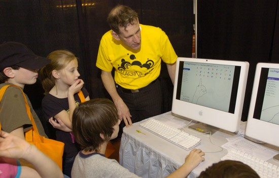 Jeffrey Cougler shows children at Imagine RIT: Innovation and Creativity Festival how to use his software.