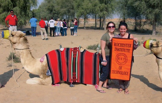 Evan Coyne, right, recently won the prestigious Statler Foundation Scholarship of Excellence for her strong academic performance and activities within the tourism and hospitality industry. She was among a group of RIT students who traveled to RIT Dubai to study the growing tourism industry in the United Arab Emirates. While there, Coyne and classmate Traci Earwood took a camel ride, bringing a little bit of RIT to the desert.