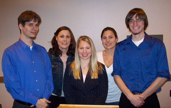 From left, Kyle O’Neill, Elizabeth Reeves O’Connor, Kayla Rohr, Keri Barone and Ryan Burst. Burst won the top honor May 6 in RIT’s Institute Public Speaking Contest. He, O’Neill and Rohr are students in an Advanced Public Speaking course taught this spring by Barone and O’Connor.