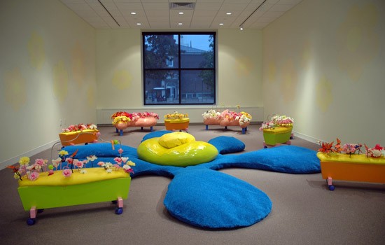 Lorrie Frear, RIT professor of graphic design, designed and painted a wall mural of flowers that accompanies Flower Blobs Bloom.