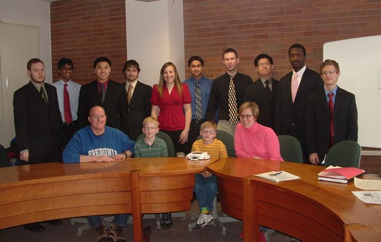 Members of the RIT senior design team are congratulated by the Fortner family of Rochester. The team designed an interactive game for their son, Luke, that won the 2009 IEEE Student Design Award. (Front row) Mike Fortner, Jack Fortner, Luke Fortner, Cindy Fortner (Back Row) Jesse Muszynski, Ketan Surender, Christopher Yang, Nick Babin, Alana Malina, Neil Pinto, Robert Modzelewski, Pei Hong Tan, Claude Jerome, David Carmichael
