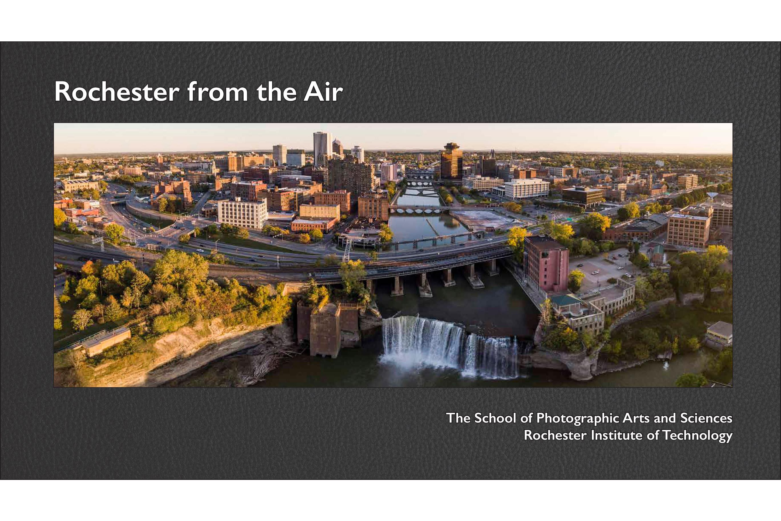 A special deluxe edition of photobook Rochester from the Air will be printed by Kodak on one of its NexPress digital color presses and showcased at “Taking Print Further.” The publication is a collection of drone-taken panoramic images of Rochester landmarks that Cost’s class captured during the fall semester.