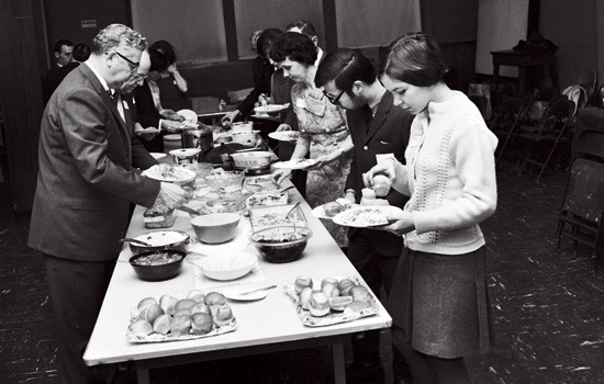 That’s me, Cathy Croom ’68 (art and design), with my future husband, Ken Chin ’69 (photography), in line at the buffet table.