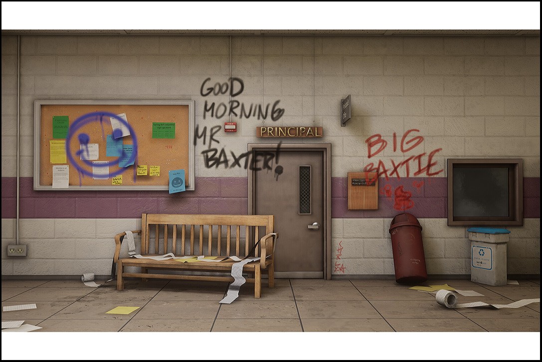 An environment from Matthieu Mouton’s capstone project “Lambster High,” a real-time environment of a school that fell victim to overnight vandalism.