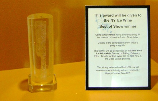 Beccy Feather’s original glass sculpture will be awarded to the winery voted Best in Show during the 2010 New York State Ice Wine Competition. It was on display during the recent Ice Wine Festival at Casa Larga Vineyards, Feb. 20.