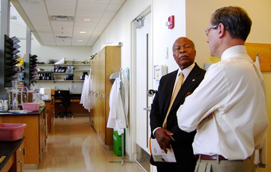 Former U. S. Secretary of Health and Human Services Louis Sullivan recently toured laboratory facilities in the Center for Bioscience Education and Technology with Richard Doolittle, professor of medical sciences and assistant provost for undergraduate education. Sullivan was on campus to discuss diversity in health care and the changing trends in the health care field.