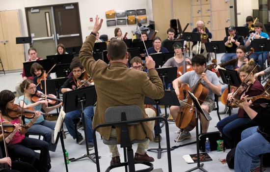 Michael Ruhling, associate professor of fine arts/music and conductor of the RIT Orchestra, leads a rehearsal for the spring concert. Students from a variety of majors participate in the orchestra and take it for course credit.